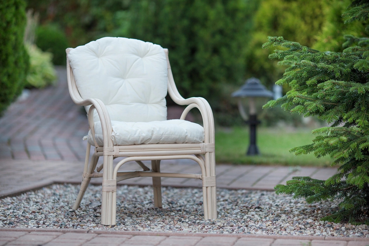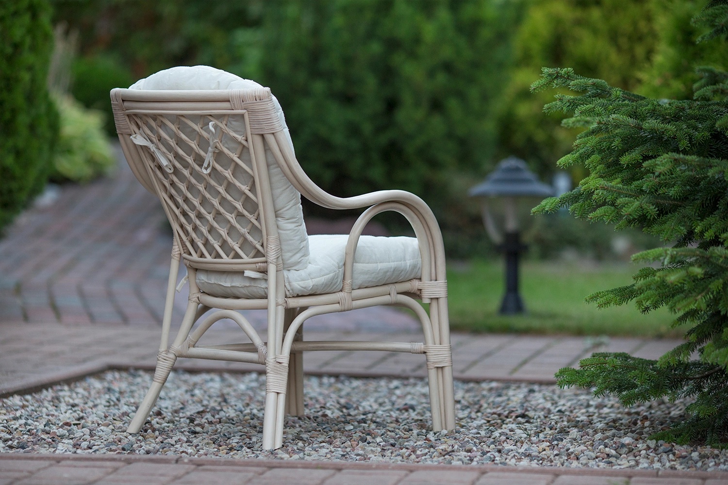 Jasny fotel rattanowy, delikatny wizualnie ale trwały konstrukcyjnie. Wypleciony i wykonany ręcznie z naturalnych pnącz rattanowych, wybarwiony na kolor lekko stonowanej bieli. Do domowego salonu, na użyteczny taras, do zimowego ogrodu..
