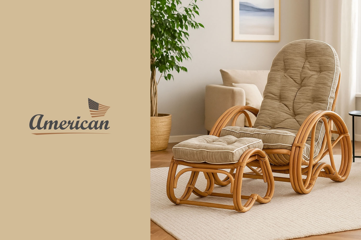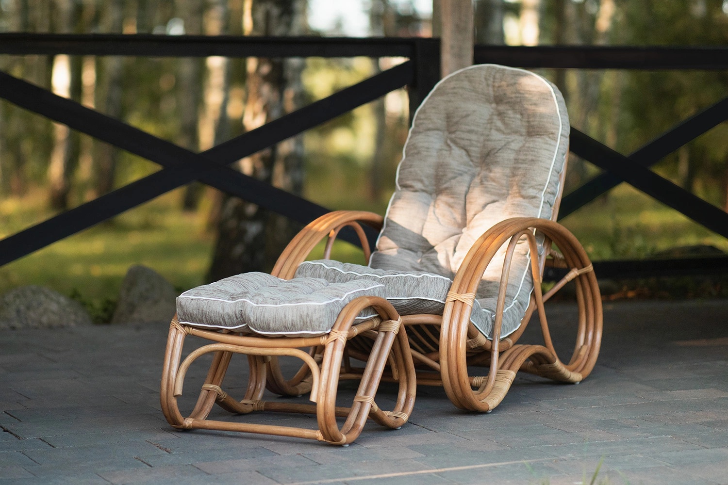 Bequemer Sessel aus natürlichem Rattan mit Fußstütze und Kissen in honigbrauner Farbe. Außergewöhnlich komfortabel und bequem. Auch robust und langlebig dank der dreifachen Rattan-Flechtung. Einfach bequem hinsetzen und den Moment genießen.
