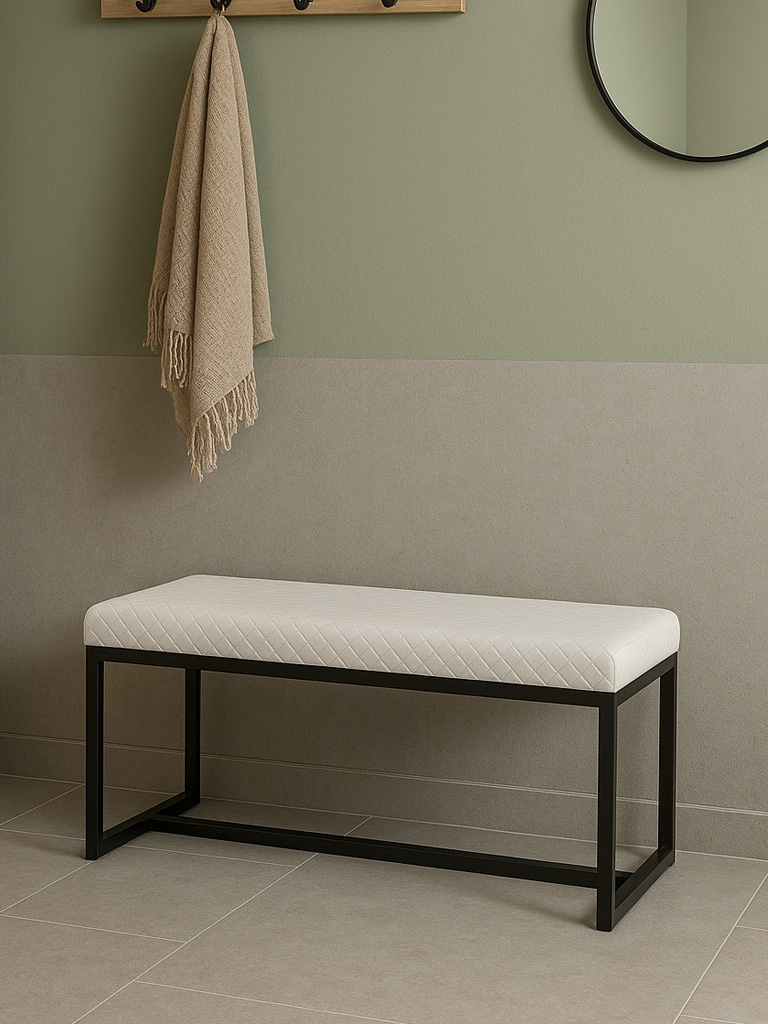 Die schwarze Konstruktion macht diese Bank zum idealen Accessoire für industrielle, moderne und Scandi-Loft-Einrichtungen. Die Kombination aus rohem Metall und weicher Polsterung schafft einen Kontrast, der Blicke auf sich zieht und dem Raum eine besondere Ausstrahlung verleiht.