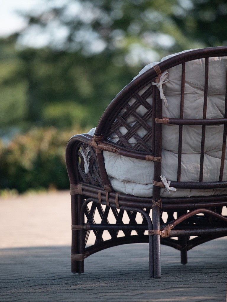 Bank aus Rattan für zwei Personen mit einem Set schöner Kissen