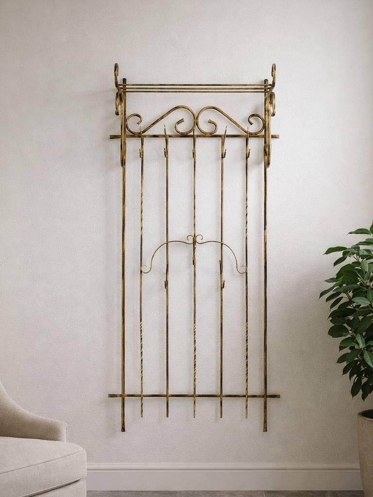 Ein stilvolles Interieur besteht nicht nur aus den richtigen Möbeln, sondern auch aus Details, die dem Raum eine besondere Note verleihen. Oft sind es gerade die kleinen Feinheiten, die das Gesamtbild perfekt machen. Unsere hängende geschmiedete Garderobe mit Ablage vereint klassische Eleganz mit praktischer Funktionalität. Hergestellt in Polen, begeistert sie mit höchster Verarbeitungsqualität und Liebe zum kleinsten Detail. Das ist nicht nur eine Garderobe – das ist eine Zierde für Ihr Zuhause.