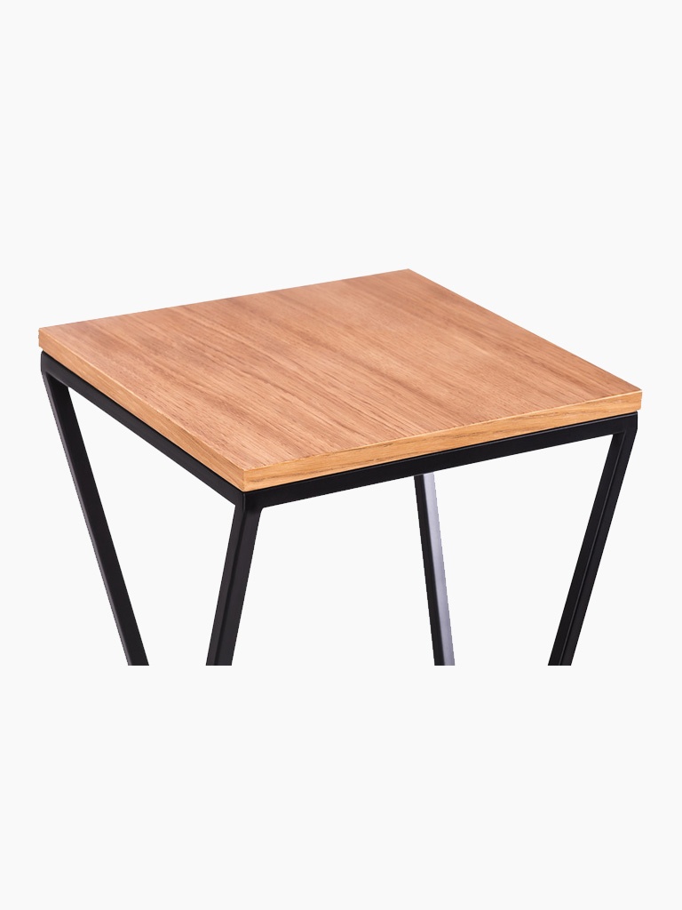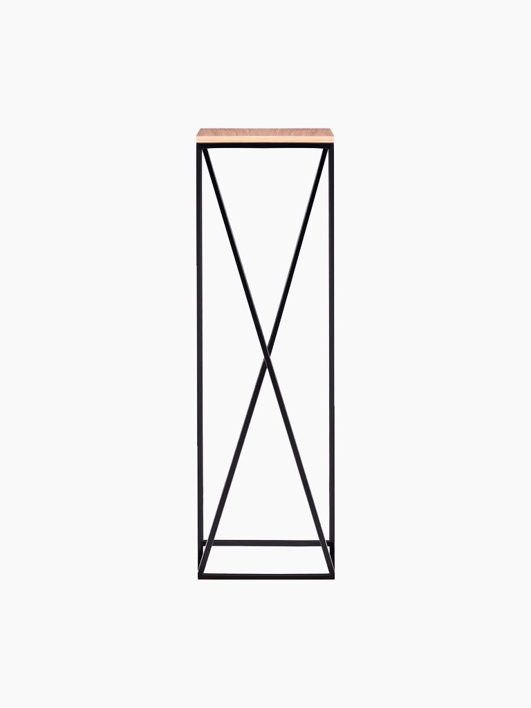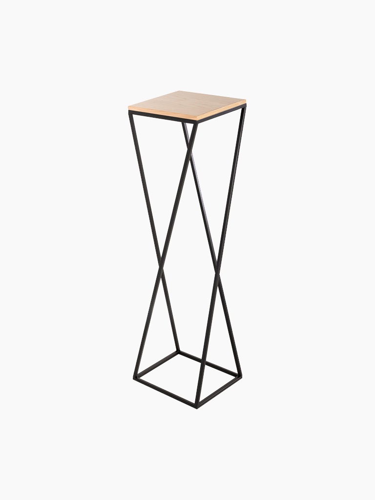 Das Gestell aus hochwertigem Metall sorgt für Stabilität und Langlebigkeit, während die Holzoberfläche natürlichen Charme verleiht. Dank seines minimalistischen Designs wirkt der Ständer nicht überladen, sondern ergänzt den Raum dezent. Der geometrische Rahmen mit einer quadratischen Basis, der sich nach oben kreuzt, verleiht ihm einen industriellen, aber dennoch leichten Look.