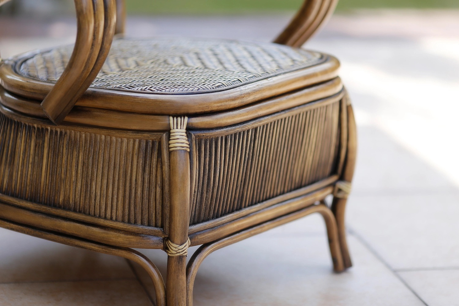 - eine stilisierte Bank aus Rattan und Bambus