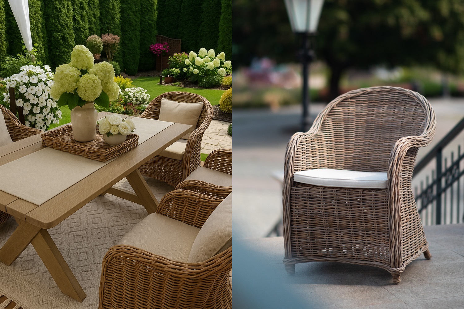 Ob drinnen oder draußen, Holz und Rattan passen gut zusammen und schaffen eine außergewöhnliche Einheit.