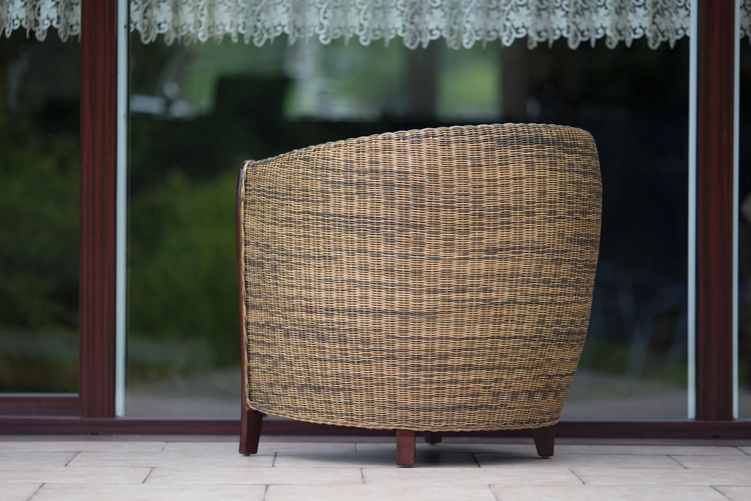 Rattan Sessel mit Mahagoniholz-Akzenten, halbrund, leicht stilvoll und gleichzeitig elegant. Häufig genutzt für den Morgenkaffee im heimischen Rückzugsort, ideal auch als dekoratives Element im Raum.