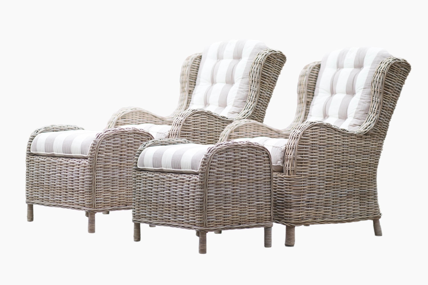 Zwei Rattan-Sessel mit Fußhockern, aus natürlichem Costa
