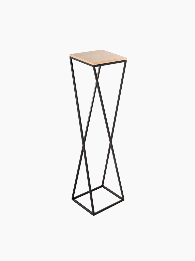 Universeller Ständer im Loft-Stil, der eine rohe Metallbasis mit der Wärme von natürlichem Holz verbindet. Das minimalistische Design passt sowohl in Wohnräume als auch in gewerbliche Bereiche – Büros, Empfangsräume oder Cafés. Die Platte besteht nicht aus Massivholz.