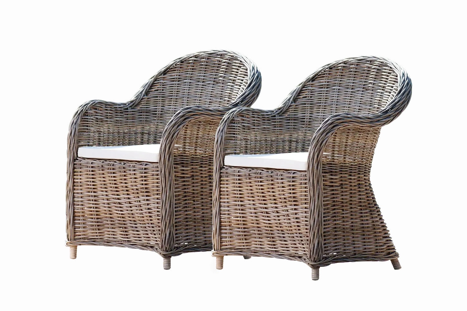 Rattansessel in einem schönen Grauton, Set aus zwei Sesseln aus natürlichem Rattan mit weißen Kissen. Ideal für Haus und Garten, bringen sie Wärme und Stil.