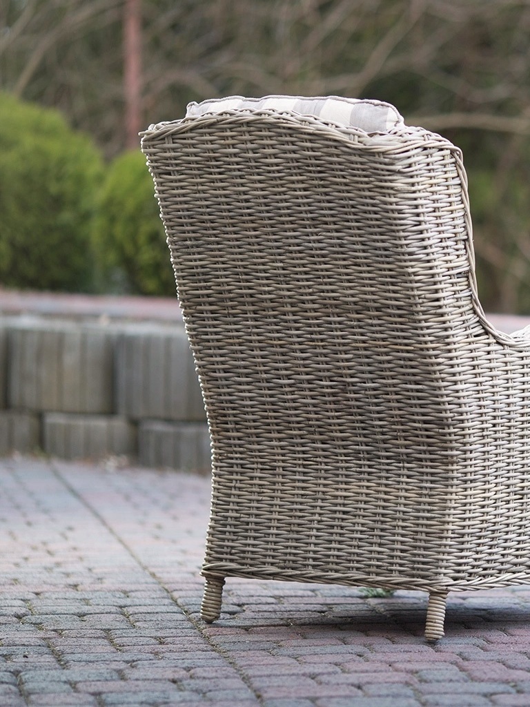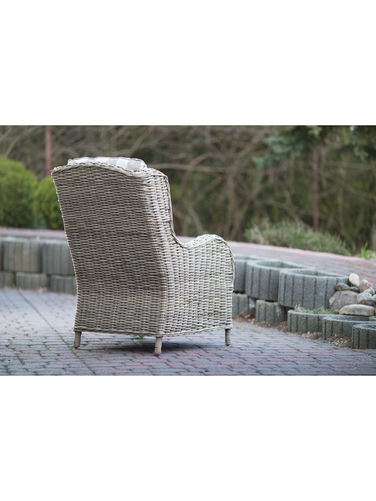 Fotel rattanowy m36 w szarym kolorze z wysokim oparciem. Często wykorzystywany przy drewnianych, lekko surowych stołach. Grube wyplatanie oraz barwa i wykończenie czynią go lekko rustykalnym, lekko surowym.