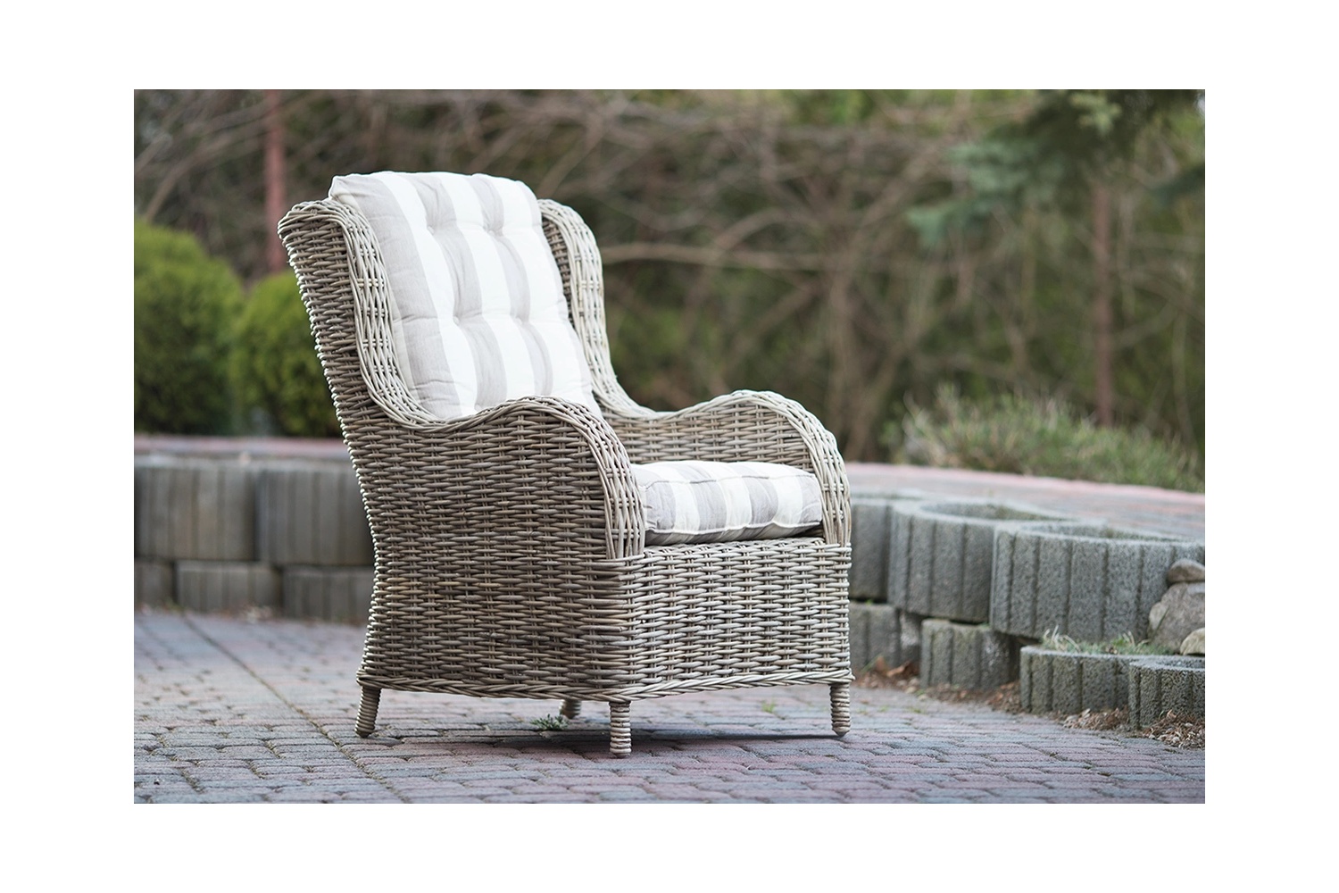 Fotel rattanowy, szary, rustykalny i wygodny z wysokim oparciem