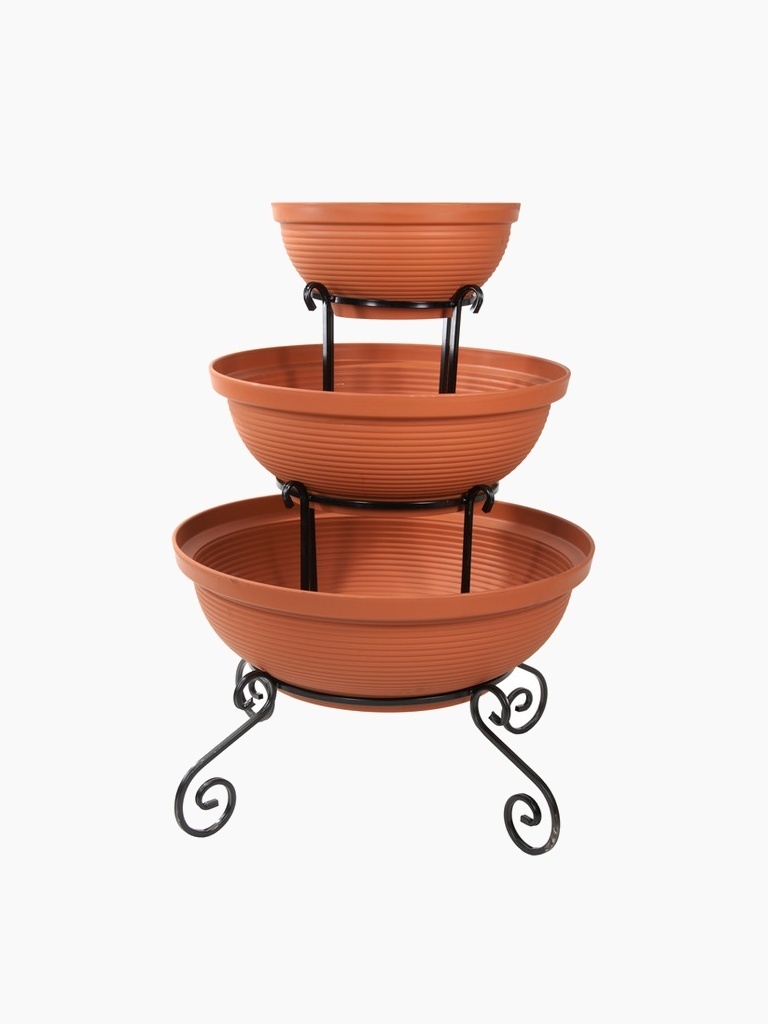 Dzięki trójpoziomowej konstrukcji kwietnika ogrodowego można stworzyć efektowną kompozycję z roślin różnej wysokości i kolorystyki. Na górnym poziomie doskonale prezentują się rośliny zwisające, na środkowym – średniej wielkości kwiaty, a w dolnej donicy można umieścić rośliny o bujnych liściach lub kwitnące na różne kolory. Takie zestawienie tworzy harmonijną, piętrową aranżację, która stanie się dekoracyjnym punktem ogrodu, tarasu lub przestrzeni balkonowej.