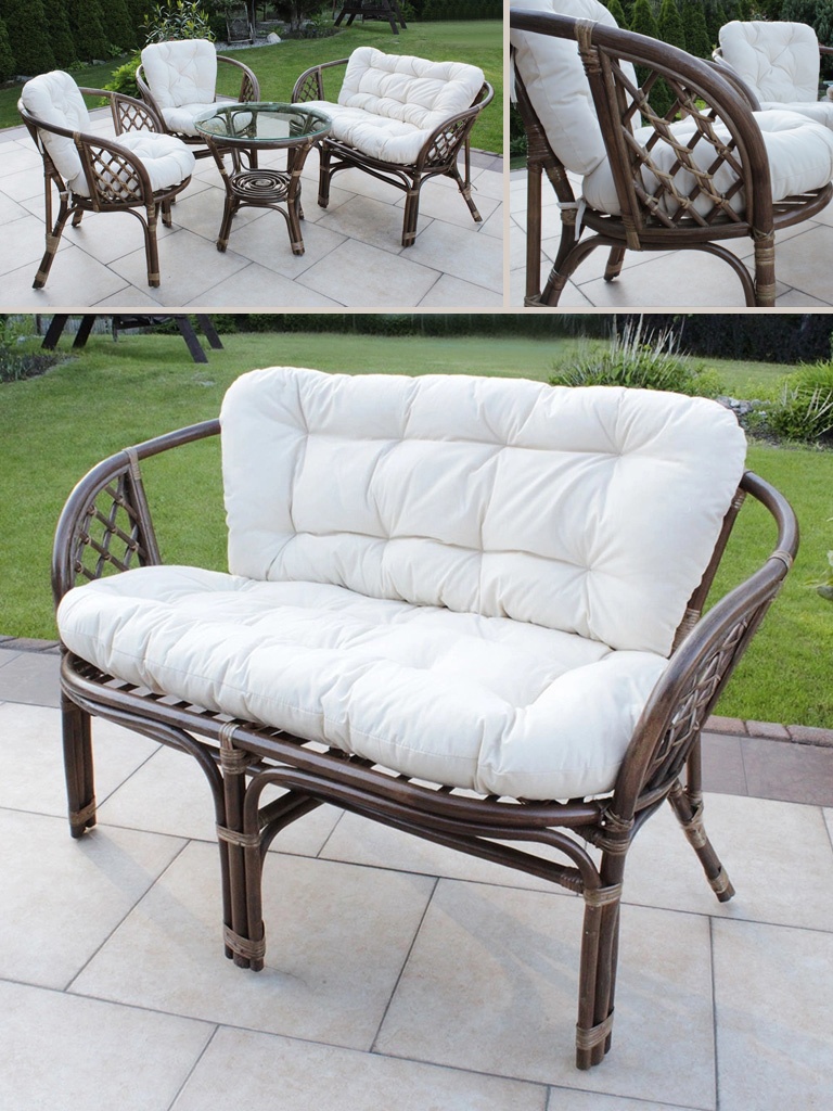 Rattanowa ławka ogrodowa M04L - ciemny brąz, biała poducha..