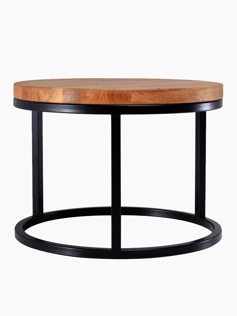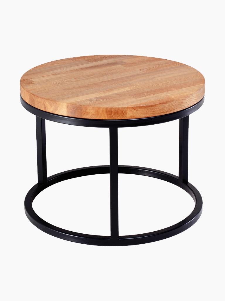Wyjątkowo solidny stolik okrągły w stylu loftowym, metalowe nogi z drewnianym, dębowym blatem olejowanym.
