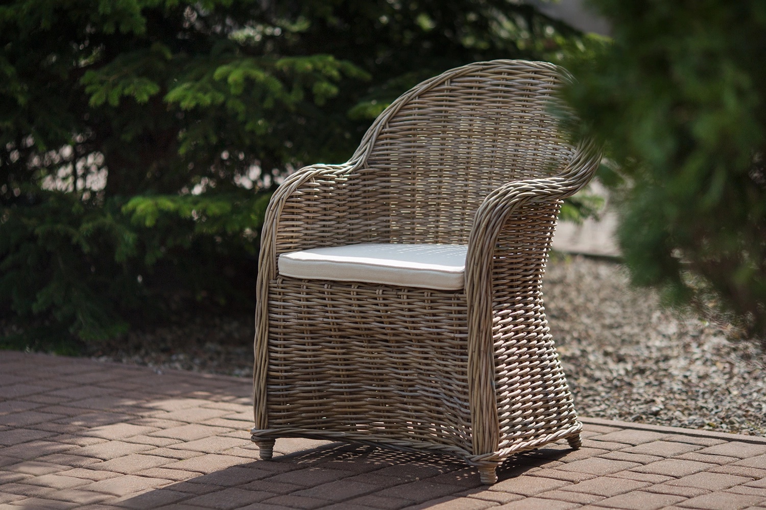 Fotel rattanowy w odcieniach ciepłej szarości. Naturalny, przyjemny. Ręcznie pleciony z naturalnego rattanu, w komplecie z poduszką. Idealny do wnętrz rustykalnych, sielskich, prowansalskich. Wszędzie tam, gdzie obecne są naturalne akcenty..