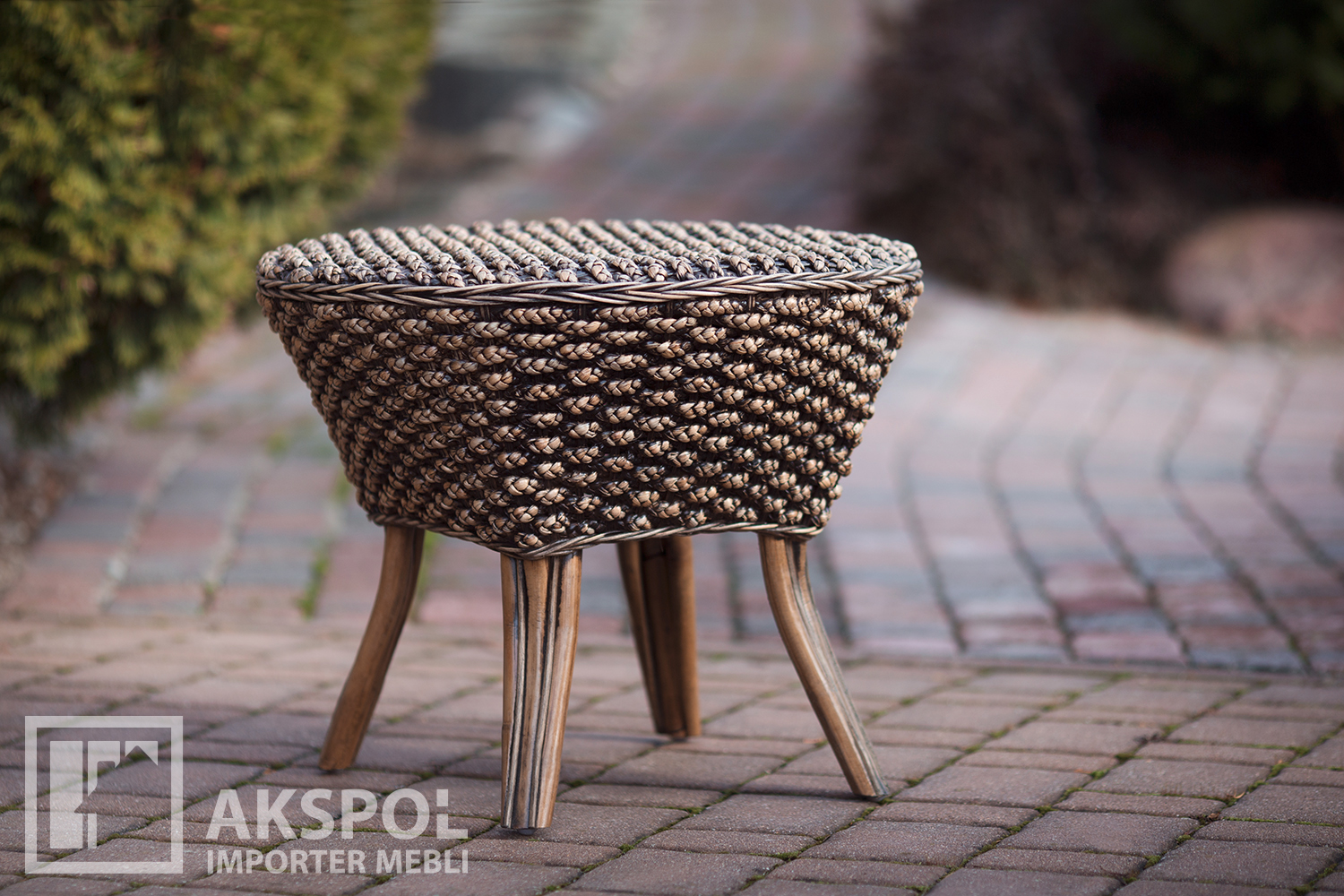 Wyplatany abaką, naturalny stolik rattanowy Deron na czterech nóżkach. Mebel rattanowy ręcznie wykonany, zdecydowanie unikalny. Okrągły blat z możliwością dorobienia szyby bądź korzystania w niezmienionej formie. Na nim taca ze słodkościami oraz kieliszkiem wina..