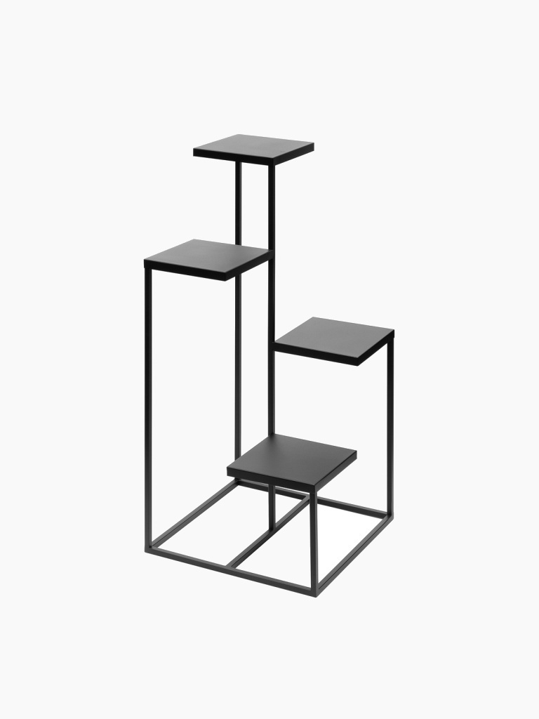 Kvetinový stojan má štyri plné kovové police umiestnené v rôznych výškach. Otvorená konštrukcia z geometrického rámu mu dodáva ľahkosť, pričom zaručuje stabilitu a odolnosť. Vďaka svojmu tvaru krásne zvýrazní črepníkové rastliny, dekorácie alebo knihy.
