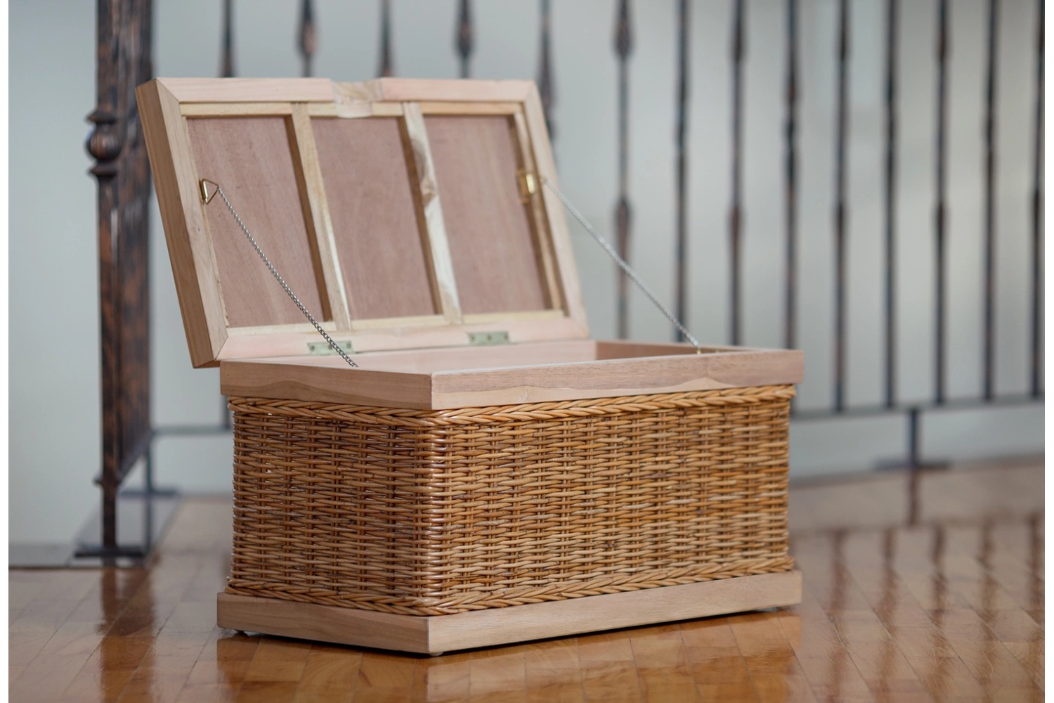 Vyplietaný prútím, veľká truhlica v drevenom ráme na uskladnenie rôznych predmetov.