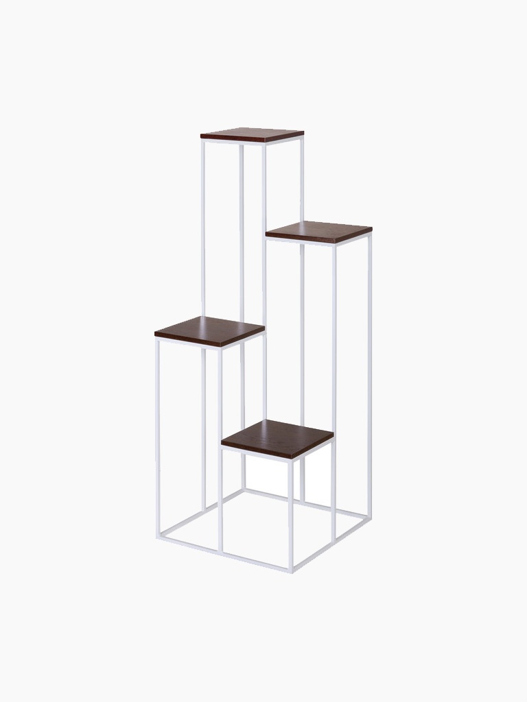 Štvorcová základňa zaručuje stabilitu a pevnosť, zatiaľ čo vertikálna konštrukcia v tvare spojených kvádrov umožňuje harmonické rozloženie rastlín v rôznych výškach. Stojan na 4 rastliny je vyrobený z odolného kovu a doplnený o drevené poličky s kvalitnou dyhou, ktoré mu dodávajú teplý a prírodný charakter.