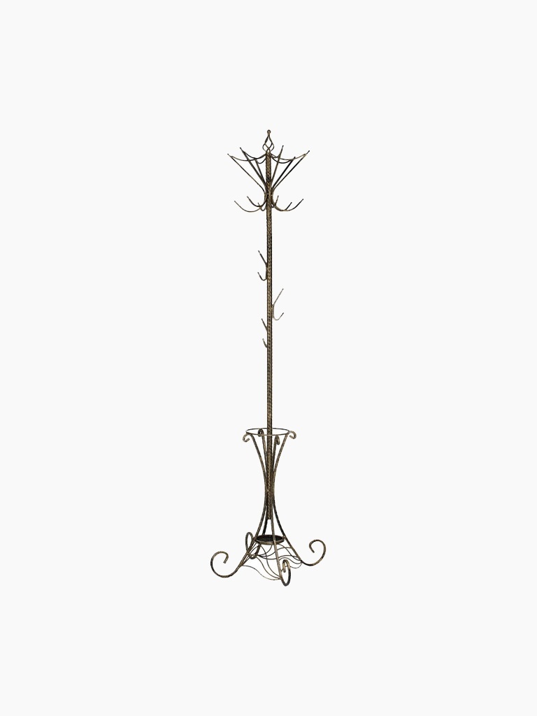 Elegantný, štýlizovaný stojanový vešiak je ideálnym riešením do vašej predsiene, kancelárie, hotela či verejných priestorov. Jeho jemne antický štýl a praktické miesto na dáždniky spájajú krásu s funkčnosťou.