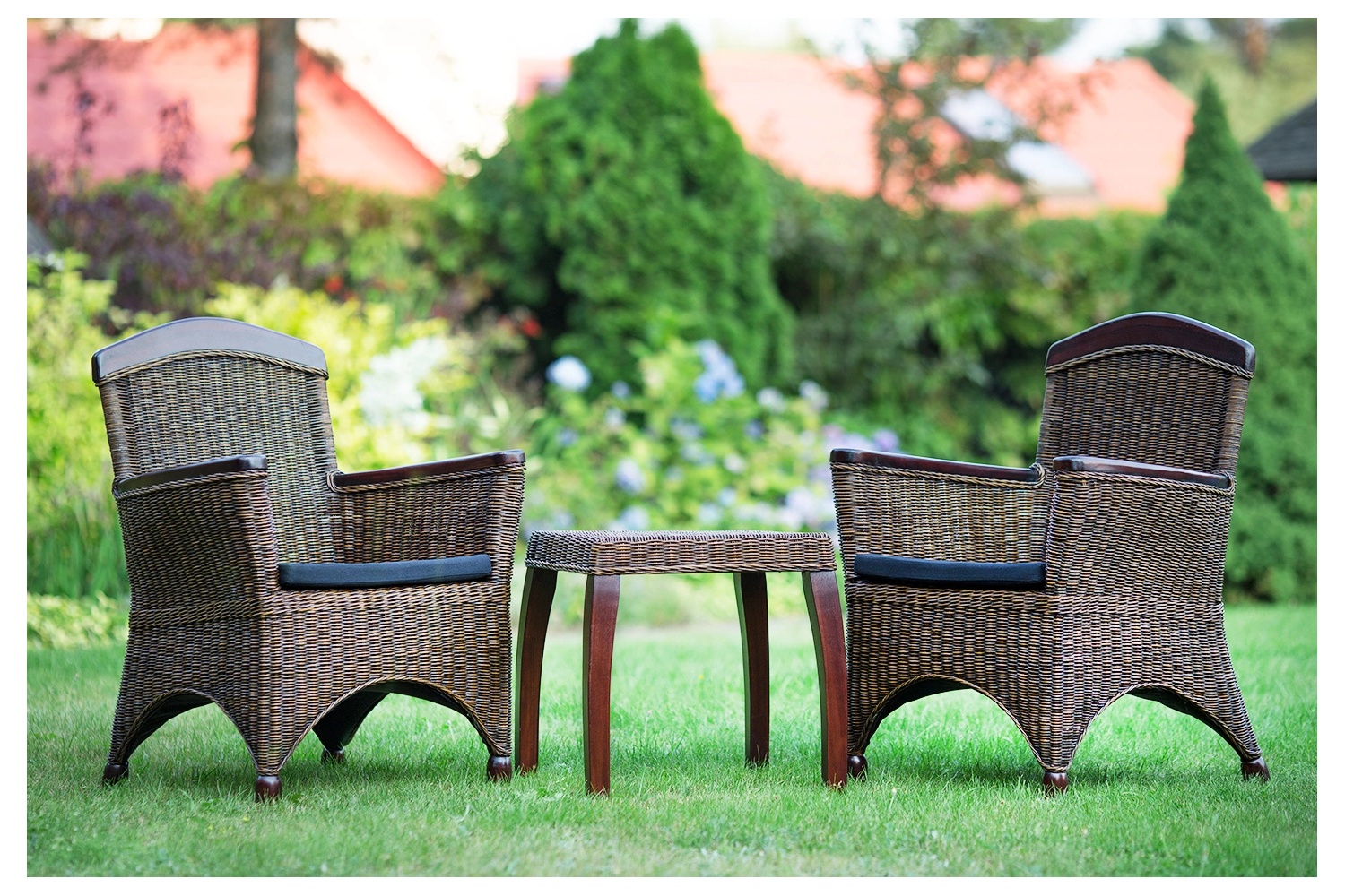 Elegantná súprava ratanového nábytku, dve kreslá so stolíkom s drevenými prvkami. Na výrobu sa používa výlučne masívne mahagónové drevo. Ratanový kávový set na vašu terasu, balkón alebo do domácej obývačky...