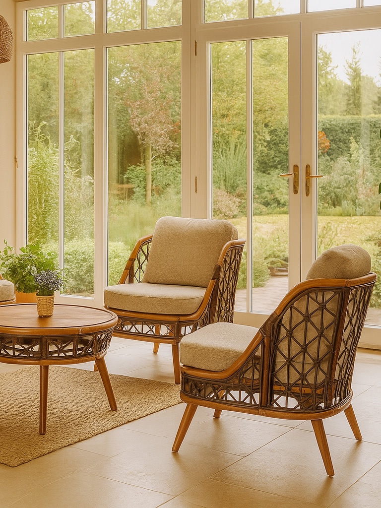 - Rattan naturalny oraz pełne drewno
