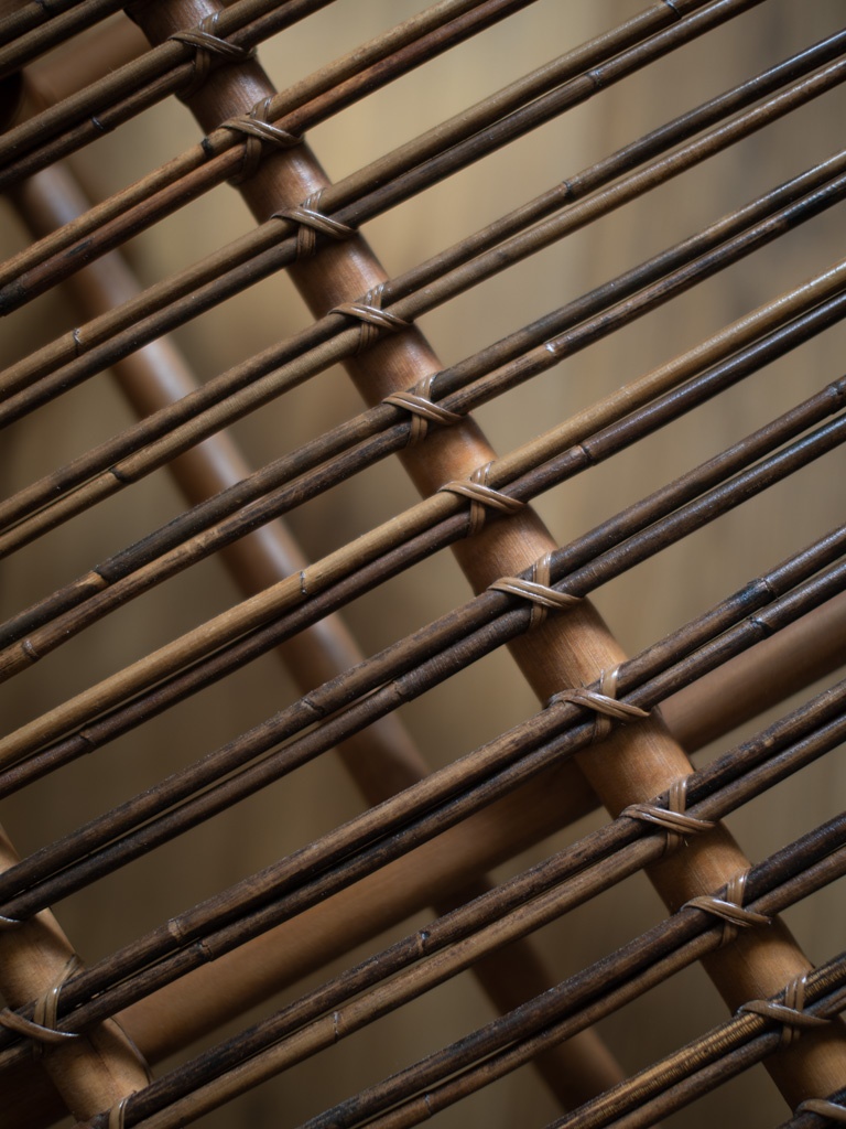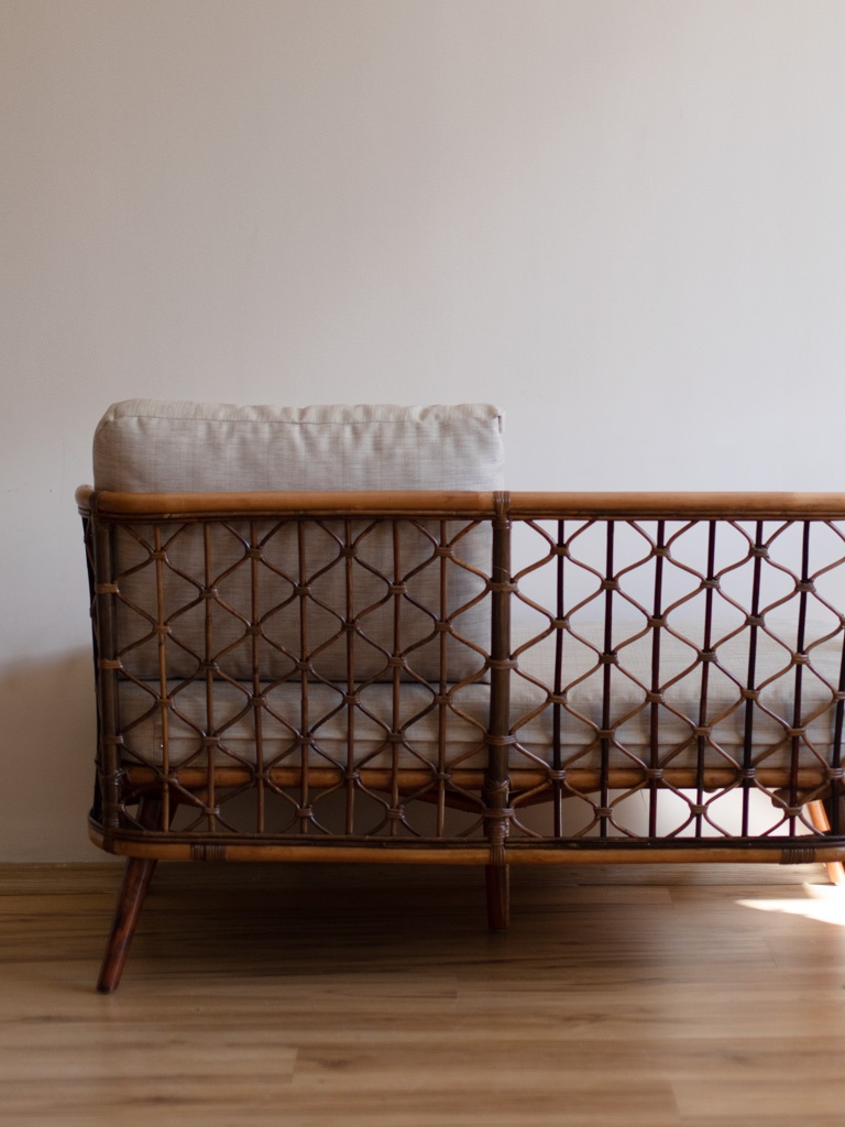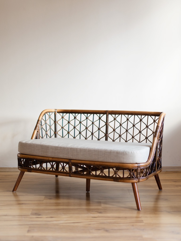- Sofę rattanową z drewnianymi nogami